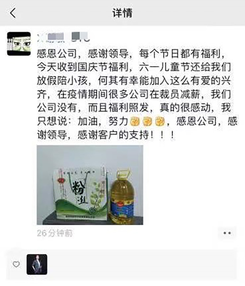 一直以来,兴齐眼药始终秉承“以人为本”的企业文化,每逢重要节日来临之际,都会以不同形式送上节日祝福和暖心福利,公司的关爱和祝福随着福利都传递到每一名员工心中,让职工切实感受到来自企业的慰问和实实在在的福利,进一步加强企业向心力和团队凝聚力,为集团高质量发展汇聚磅礴力量。